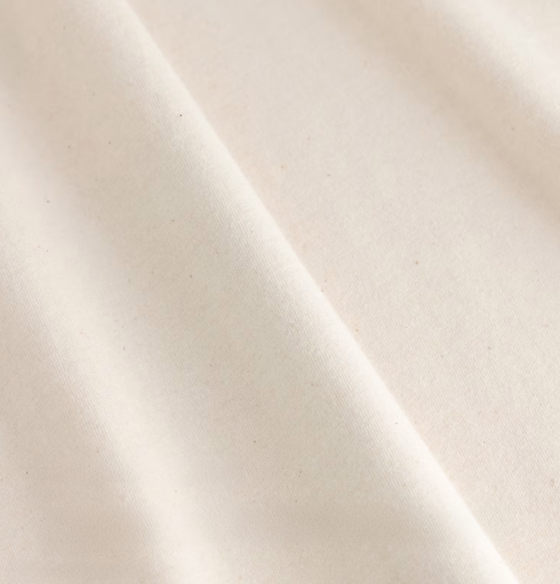 Natural Raw ist die natürliche Farbe der Baumwolle, ohne zusätzliche Färbung. Der Ton bewegt sich zwischen einem zurückhaltenden Creme- und Off-White-Beige. Da der Stoff unbehandelt ist, können kleine Fasereinschlüsse sichtbar bleiben – sie gehören zum Material und zeigen seinen ursprünglichen Charakter.